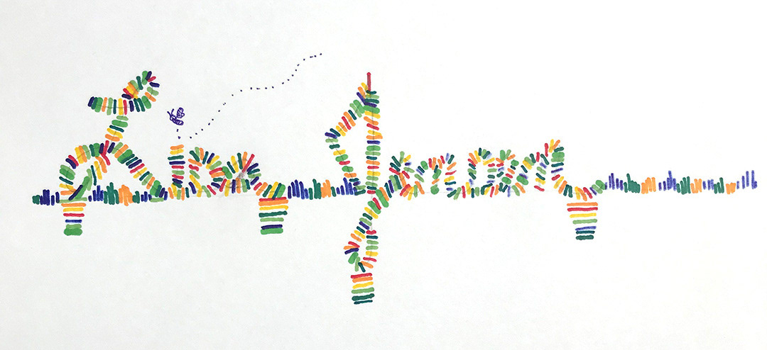 This week’s art project is inspired by UVU artist Evan West’s, Child’s Play. In the same way Evan West combines “childlike creativity and refined skills learned in adulthood,” the idea of this project is to connect to our past and create a two-part artwork, one inspired by the colors and designs of your childhood, and one inspired by your life today. You will take a word, phrase, or name (like Child’s Play) and create a colorful design around it. You can use any medium and materials you like. We used the materials below to create our example.